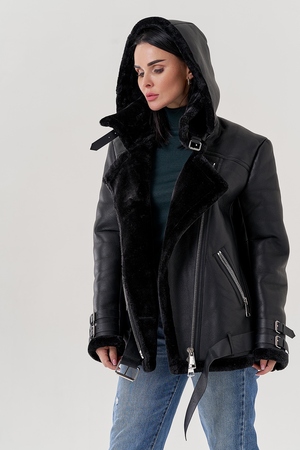 Тип ворота - съемный капюшон, эко мех черный