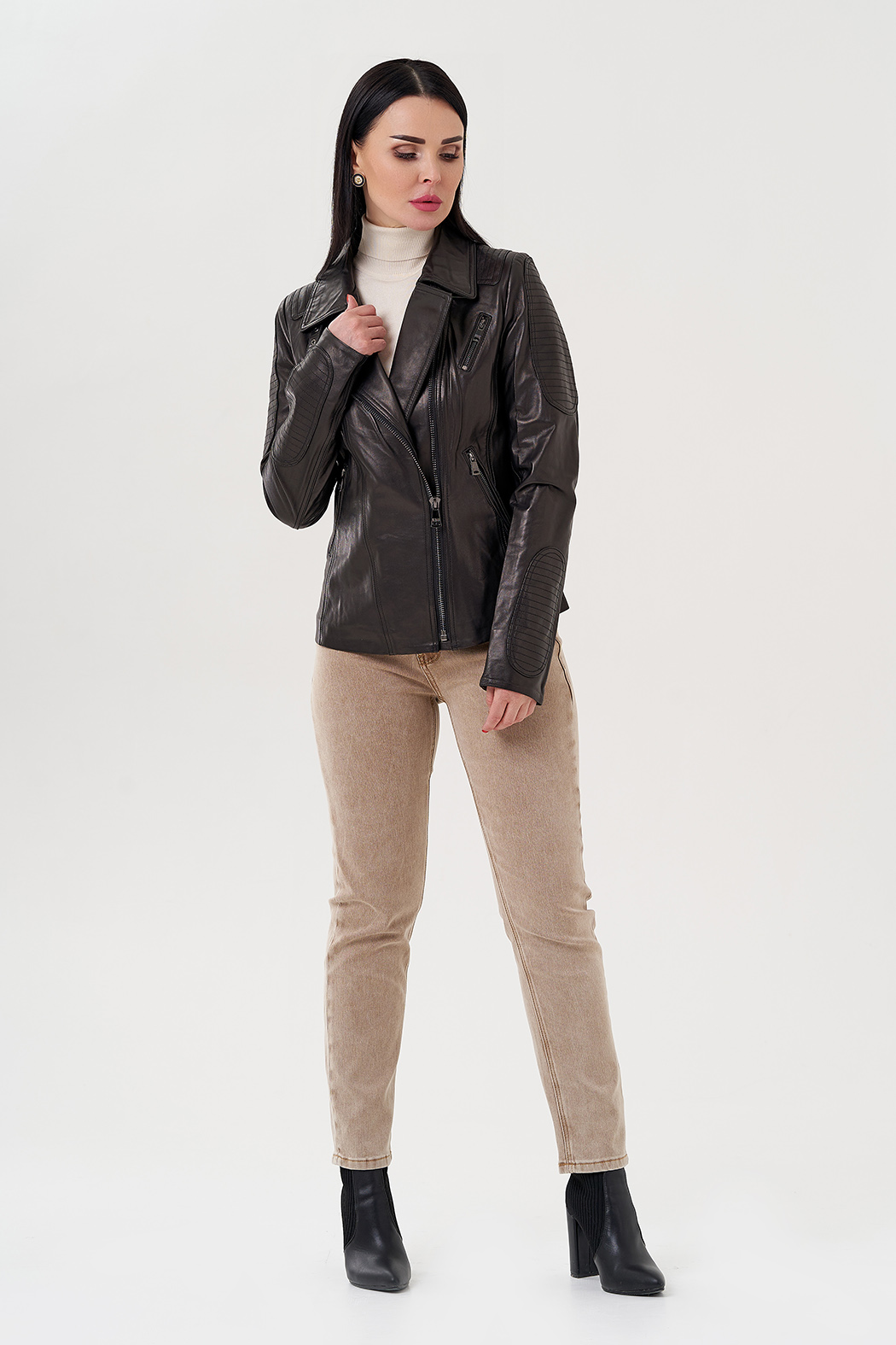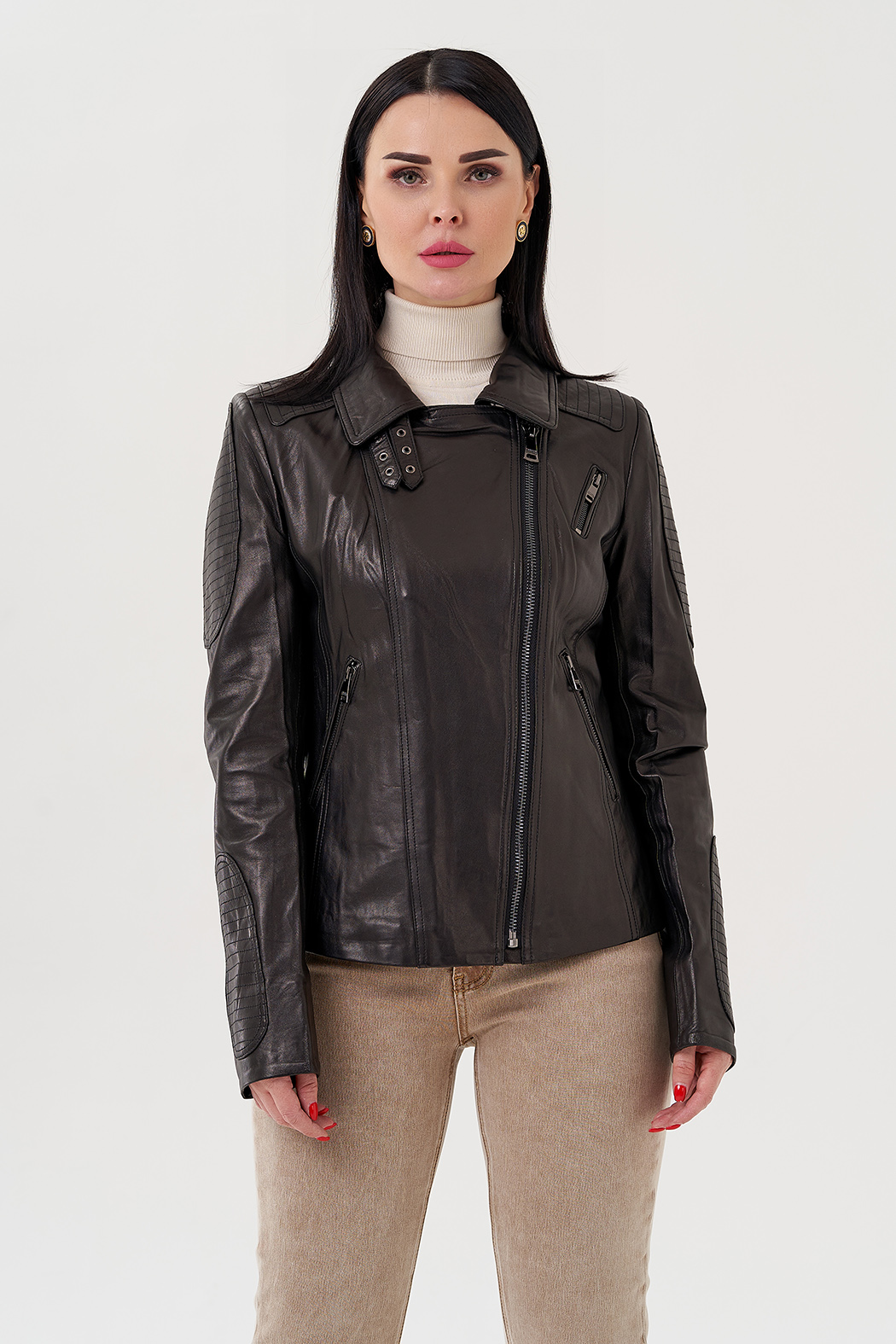 Куртка из натуральной кожи - изящная и универсальная вещь в гардеробе. Выполнена в черном цвете, что делает ее практичной. Модель приталенная, что делает ее более женственной. Застегивается на молнию. Воротник можно поднять и закрепить на ремешки. По бокам есть карманы на молнии. Куртка стилизована накладными вставкамина рукавах и плечах.