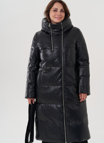 Женский пуховик из эко кожи с капюшоном (чёрный)